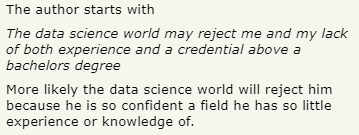 The fact that I now have a “data scientist” job and am doing just fine is prima facie evidence that my resentment at failing to break into these jobs was mostly warranted. There’s no way to expound on this without coming off as haughty, so forgive me for not going into much detail, but basically: I have a “data scientist” job at a medium-sized company, and I seem to do well enough at it to not get fired. But who knows, maybe I’ll get fired in a few weeks for poor performance, and anyone who feels insulted or annoyed by me can revel in the schadenfreude.