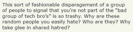 A lot of tech employees do mental gymnastics to justify why they make boatloads of money. (Similarly, a lot of tech companies do mental gymnastics to justify why they should be funded without any sensible plan of becoming profitable, or why they should even be considered “tech” companies in the first place.) Case in point, there are a handful of people in the Hacker News comments opining about why I shouldn’t make as much money as them.