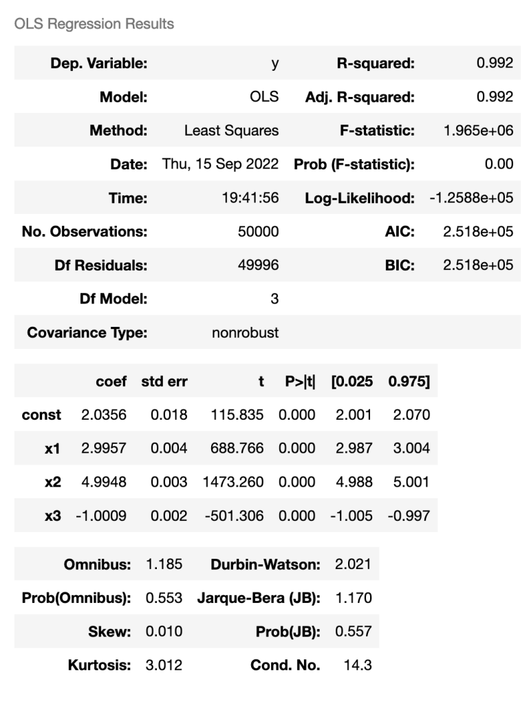 df["y"] = 2 + 3 * df["x1"] + 5 * df["x2"] - df["x3"] + np.random.normal(0, 3, size=N)