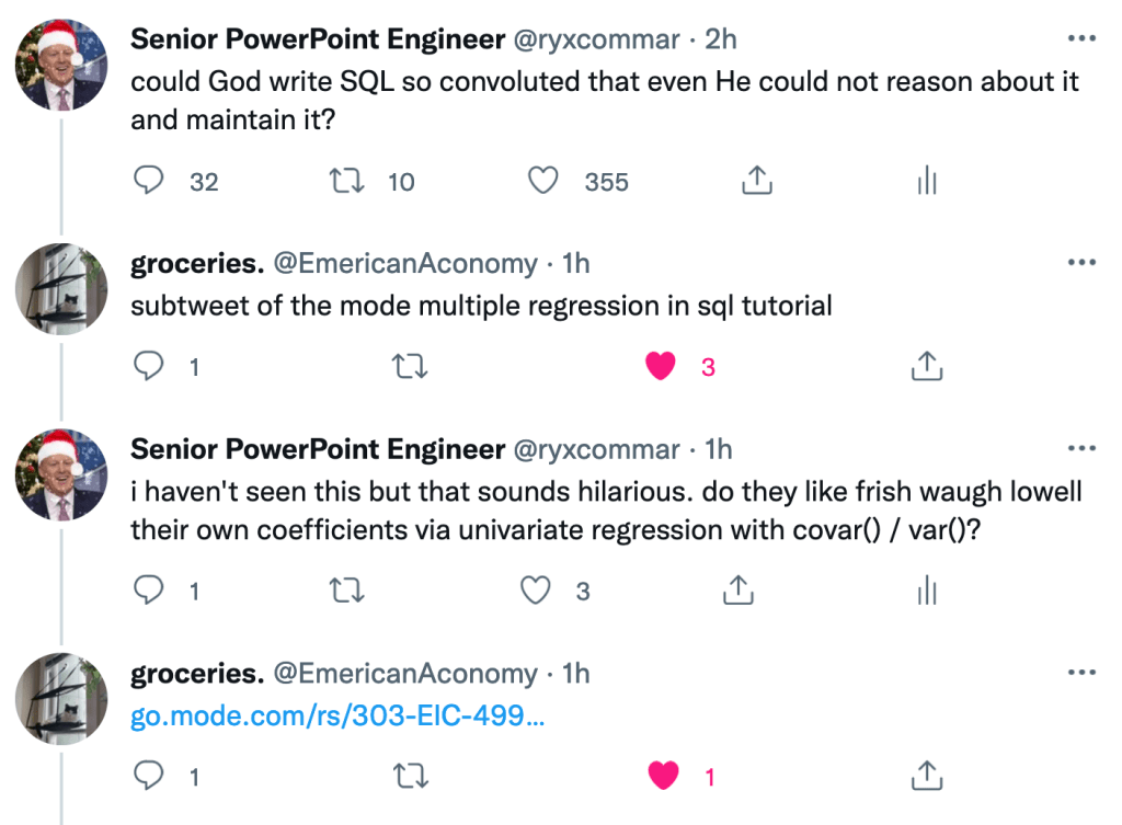 And there you have it! Multiple regression with 3 predictors, done in SQL, using nothing more complex than AVG() and SUM().